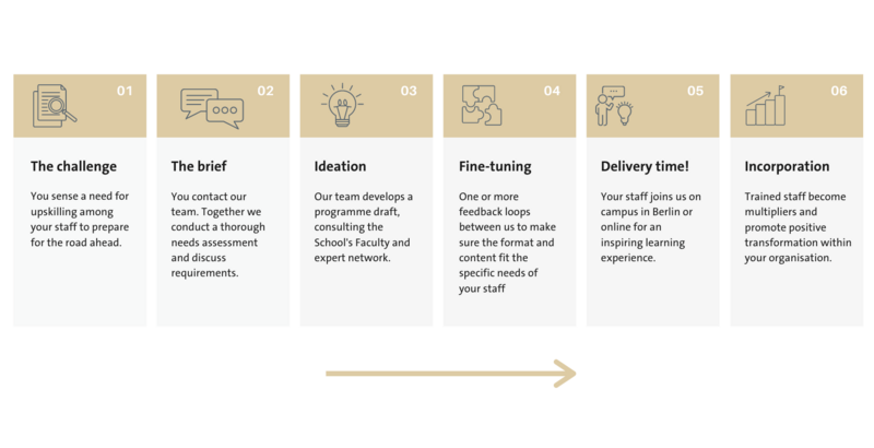 Our Executive Education team has extensive experience in developing tailor-made training experiences tackling the key challenges executives across sectors face today. Our approach is collaborative: In close cooperation with you, we identify the educational set-up and combination of didactic techniques that best fit your staff's level of experience and specific needs.Throughout this process we rely on cutting-edge research from our renowned international faculty and the school's six research centres as well as an extensive network of experts.